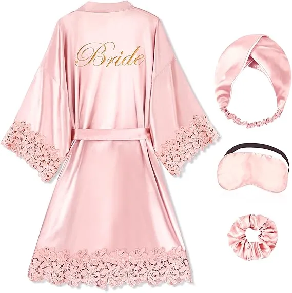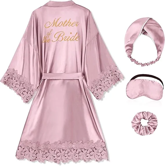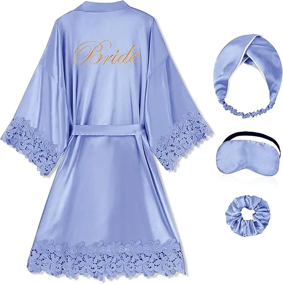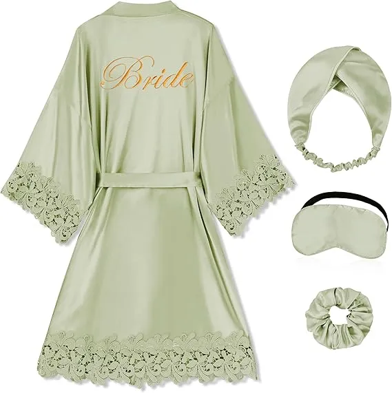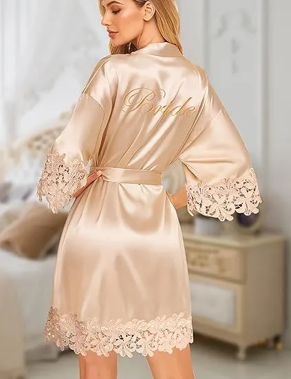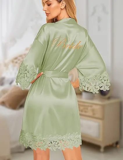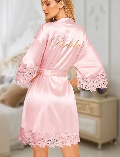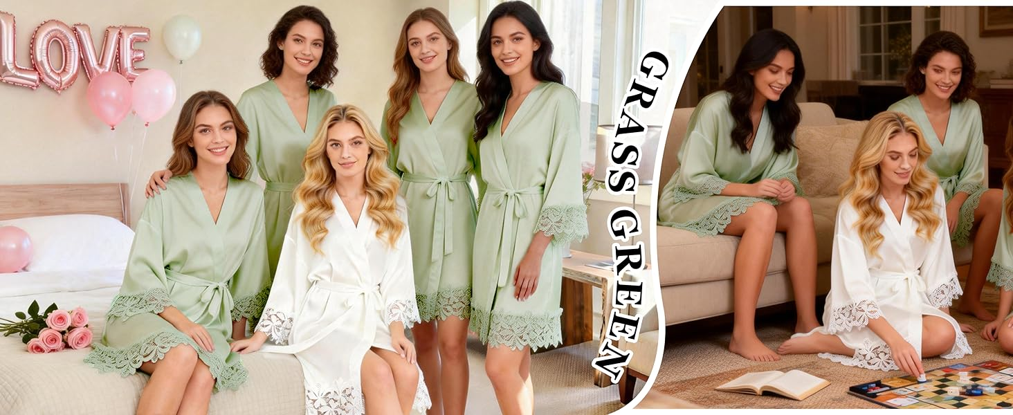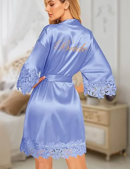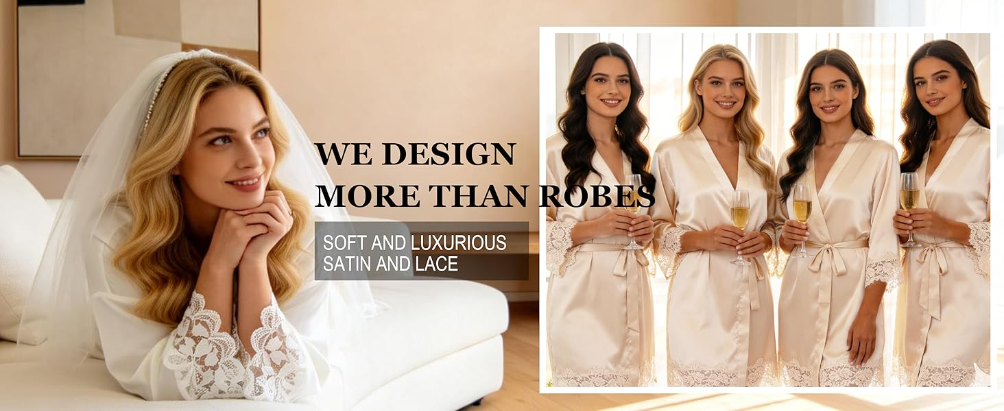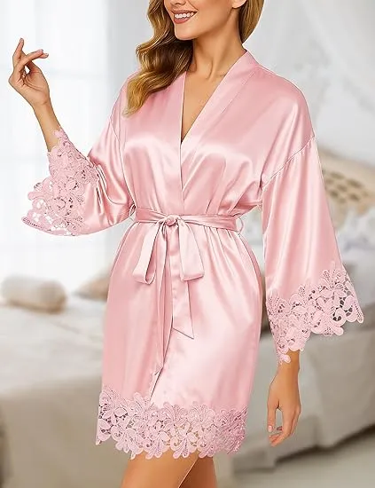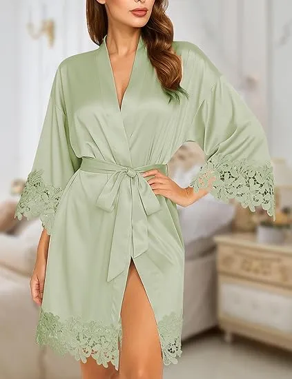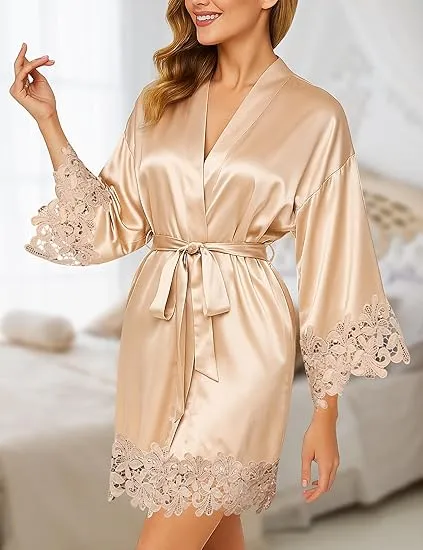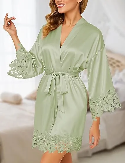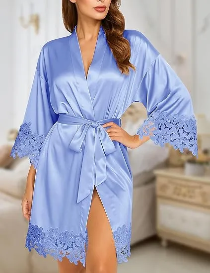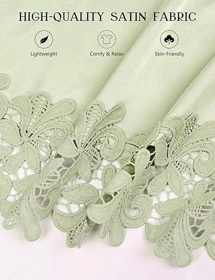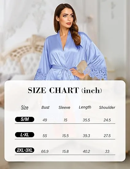 - DESIGN: Silk satin lace robes, pouch bag in matching color. One set with total 2 pieces. Unique and elegant lace color scheme, delicate lace pattern on the cuffs and hem of the robes, inner layer with its own satin fabric tie and a removable belt to fasten it, perfectly showing the beauty of women, soft and comfortable, delicate and smooth.