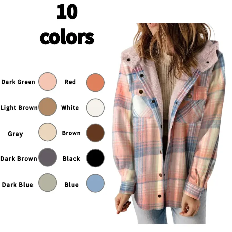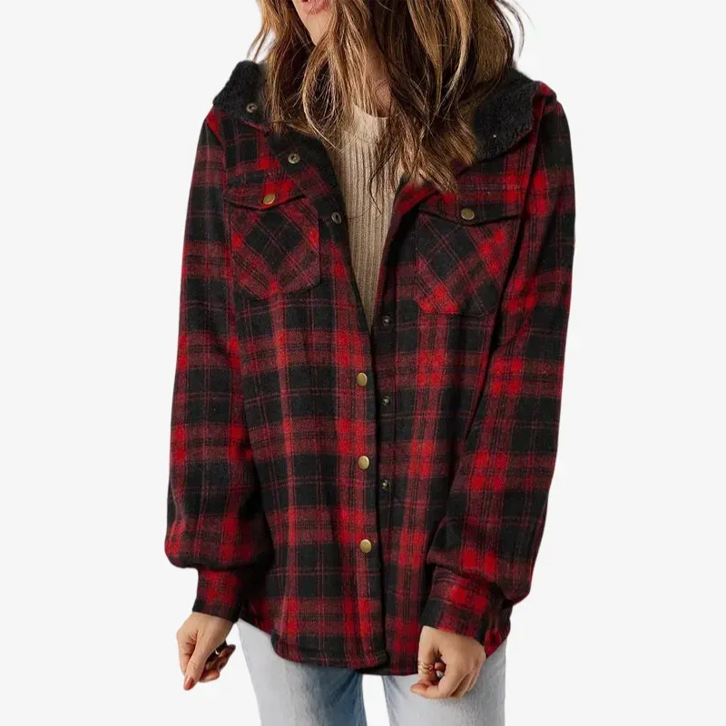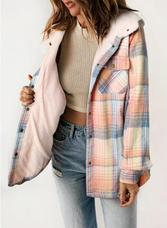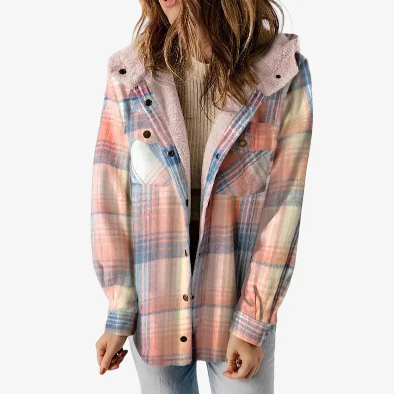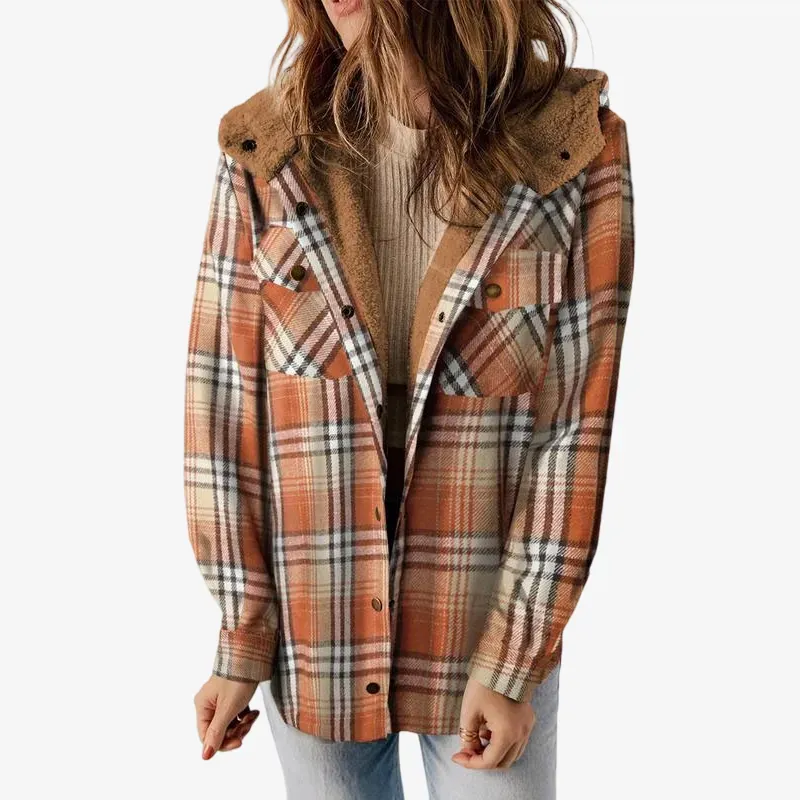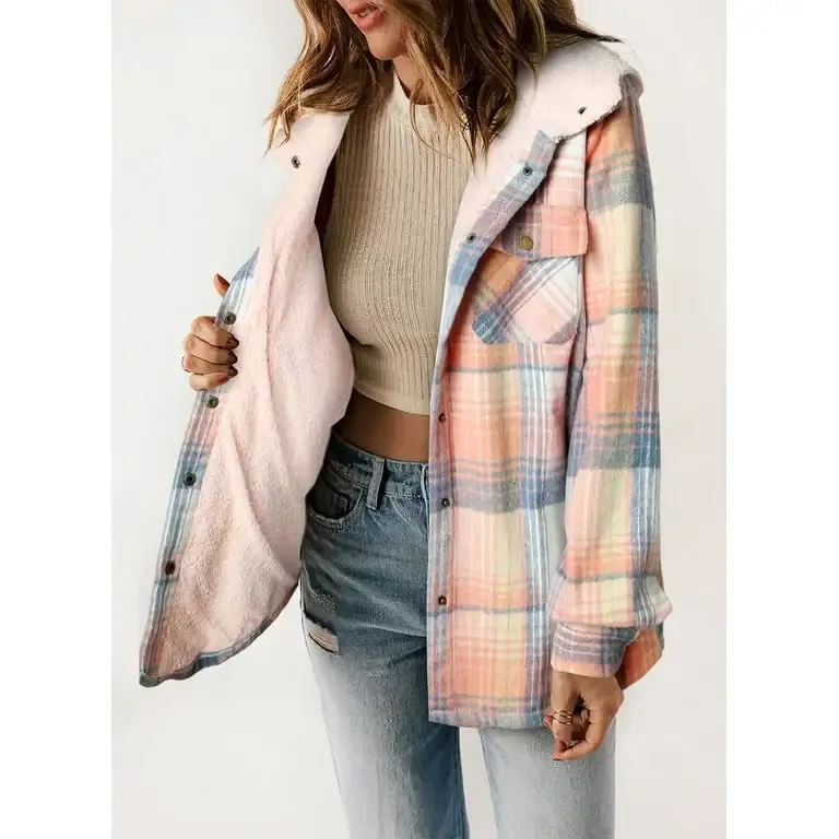 Women's Plaid / Houndstooth Print Button Front Hooded Coat