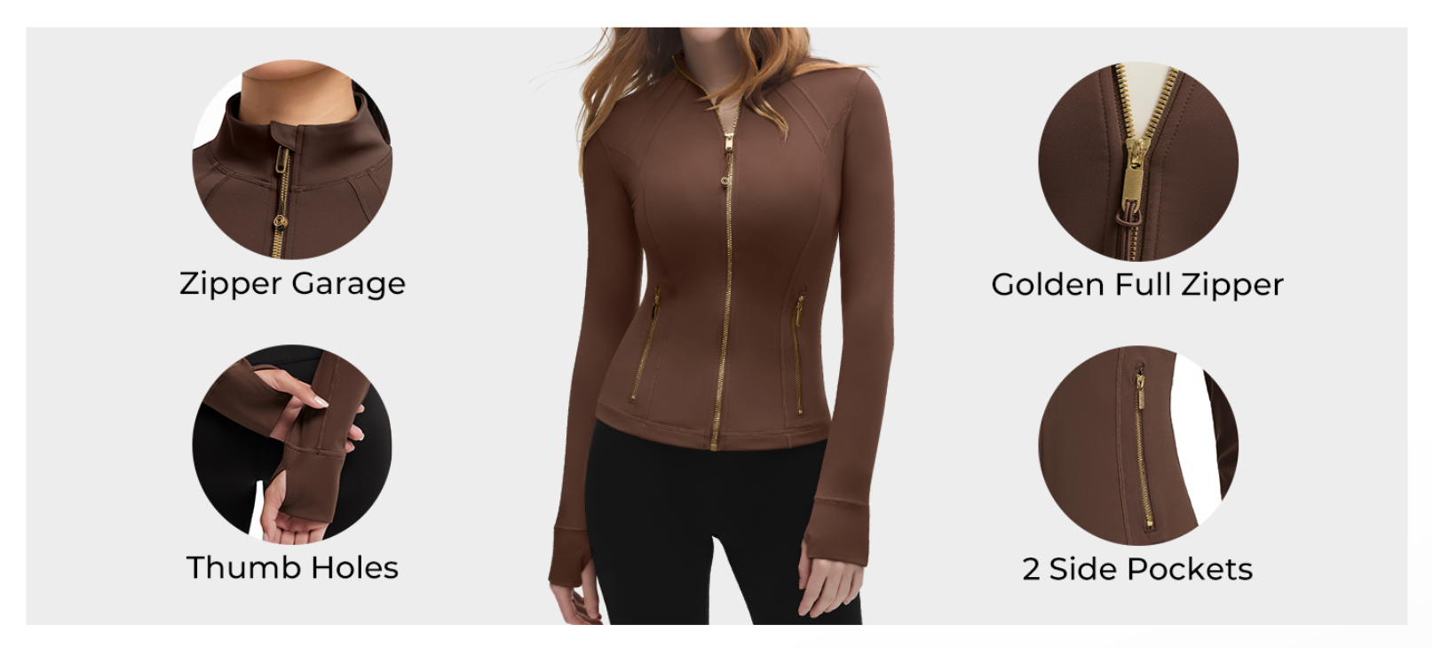 - Athletic Jacket with Thumb Holes: Hip length jackets with two side zippered pockets, Casual gym jackets with thumbholes.